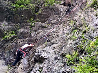昼食後、岩の濡れ方は相変わらずで、左ルートの下部では3メートルほど滑落している別パーティーの人もいた。同じ場所を三田さんと僕もリードしたが、かなり微妙だった。フォローの三田夫人もかなり辛そうだった。後に続いて僕も登り、フリクションのフの字もなかったが、汗だくでなんとかオールフリーで抜けた。以前は怖くてリードできなかった左ルート上部のクラックも意外と余裕を持って登れ、少しは上達した(あるいは麻痺してきた)のかなと感じた。右端のY級ルートでは、上の方の木の根に引っかかってしまったロープを塚内さんが難しそうなクライミングで回収に上がったりしていた。ゲレンデとはいえ本チャンは色々なことがあって結構疲れるものだと思う。