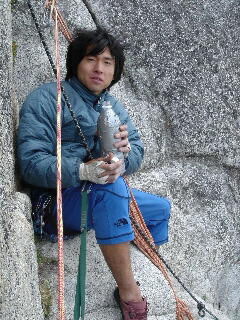 ヨセミテ・ビックウォール。クライミングをある程度やったことある人ならば誰でも知っている場所だろう。そこはまさにクライマーの聖域だ。 この計画が最初に出来たのは2003年の秋に雲表の栗原君と来年ヨセミテに行こうという話から盛り上がっていった。それまでクラックをやったことの無かった自分にしてみればそれはまさに新しい挑戦に相応しかった。実際本格的にクラックを登り始めたのは2004年をだいぶ過ぎた3月の城ケ崎だった。フェースのグレードを上げるのに夢中になってしまい。ちょっと遅いスタートだった。しかし、フェースをやっていたことはマイナスにはなっていなかった。足ジャムが下手な僕にスメアリングがフォローしてくれた。何とか6月くらいには10dあたりを登れるようになっていた。 しかし、トラブルは出発前に起こってしまう。パートナーの栗原君が仕事の都合がつかず、突然のキャンセル。振り出しに戻ってしまった…。周りで何人か行く人たちは把握していたがみんなパートナーと目標のルートも持っていてとても入れる隙間が無かった。 そんな時に近藤さんからの1本の電話が入った。仕事が何とか休めるようになったんだけど今から仲間に入れてもらえるかと。ふたたびモチベーションは上がってくる。その後、不動沢やミズガキでマルチを登りこみ、遂に出発の日を迎える。 ヨセミテ到着直後は時差ぼけや岩が日本の花崗岩よりも氷河に磨かれて滑るなどしてなかなか調子を上げられず苦労する。 やっと調子が上がって24日ハーフドームの取り付き目指し、車をカリービレッジの駐車場に置き、8:00頃出発する。取り付きまでのアプローチは2種類あり時間は掛かるがハイキングコースを辿る緩やかな道とミラーレイクという湖から直登して取り付きに上がるクライマーズトレイルの2つだ、今回僕らがクライマーズトレイルで行くことにした。道は確かに急だが60度くらいのスラブにしっかりしたフィックスがあり、快適に登ることが出来て約4時間くらいで取り付きにつく。上から声が聞こえる。1パーティー取り付いているみたいだ。持ってきたロープで2ピッチ分フィックスを張る、これで明日のスタートがだいぶ楽になる。16:00くらいには作業が終了してその後は他のルートを単独で登ろうとしていた外人と話をしたりして時間を過ごす。今回の装備はとにかくお互い軽量にしてフォローもなるべくユマーリングしないで登る計画。そのためシュラク&カバーは無し、着込んで寝るというシンプルなスタイルだった。しかしハーフドームは標高も高い分、夜は結構冷えていた。取り付きで転がって寝ていると近藤さんが焚き火を付けてくれとてもかい。 翌朝6時出発、近藤さんが先頭でユマーリングするが結構てこずっている。確かにバックロープの荷揚げ用直径7ミリのロープは結構登りづらい、おまけに体重を掛けるとかなり細くなりちぎれてしまうんじゃないかと恐ろしくひやひやさせられる。2ピッチフィックスを上がるとそこからはつるべであがる。しかしフォローはつらい。かなり軽くしてきたがそれでも重さ7キロくらいのザックを背負わなければならず、ジャミングした手が信用できず、結局カムにアブミを掛けてしまい人工で登る。体力も時間も消耗してしまう。陽が当たるのも午後2時からで陽が当たっていても風があると寒いぐらいだ。途中のテラスに水1ガロンを置いていくことにする。その後もペースは延びず結局予定していた16ピッチが終わったところにあるテラスに到達出来ずその1.5ピッチ下のチムニーの中で惨めなビバークをすることになる。フィックスして1ピッチ下りれば下にテラスはあったものの翌朝の登り返しを考え今いる場所で我慢することにした。 翌朝7時出発。しかし寒い、体は水を要求しているが寒くてとても飲む気になれない。近藤さんはダウンを着たままチムニーをずりずり上がり背中に穴が開いてしまったくらいだ。 核心は17〜19P目にあるジグザグクラックと言われる薄かぶりのフィンガークラックだ。余裕が無く人工で登るが途中エイリアンが外れて1フォールする。その後、有名なロビントラバースを通り残すところあと2ピッチ。時計を見ると18:00時を過ぎていた。その後のピッチは振り子トラバースを2回とA2のどちらも時間が掛かるピッチが残っている。振り子トラバースのピッチはボルトラダーがあるものかなり間隔が広くフリーで登らないと行けず苦労させられる。その後も下向きのシンクラックにエイリアンを決め慎重にアブミに体重を移すデリケートなピッチ、どんどん暗くなっていく空に焦せりを感じつつ慎重に行かなければない。集中力で何とかピークに抜けた時、無意識に言葉にならない雄叫びをあげてしまう。近藤さんが登ってきたのはそれから30分後の19:30。何とかその日に抜けることが出来た。 パーティーによっては頂上でビバークしてから戻る場合もあるが僕らはキャンプ地に残したラーメンが頭から離れず、疲れた