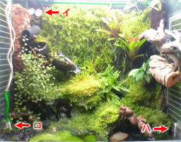 ビバリウム奥上部のイに比べ、吸気口付近であるロの数値が温湿度共に低いことが多いです。カエルはたまにイの付近まで冒険に出かけますが、大抵ロ付近で生活しているので、スースーしているところも案外嫌いではないのかも知れません。よくアルミメッシュの上に乗っていますし。水温ハは常に26度で安定しています。カエルは時々温泉のように肩まで浸かってボンヤリしています。